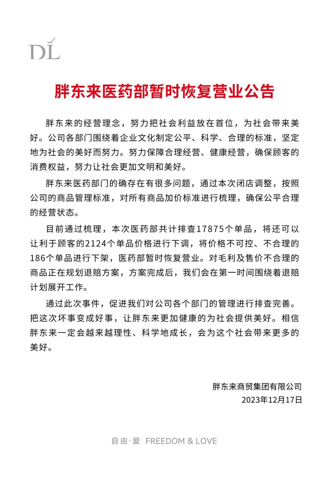 目前通過梳理,本次醫(yī)藥部共計(jì)排查17875個(gè)單品,將還可以讓利于顧客的2124個(gè)單品價(jià)格進(jìn)行下調(diào),將價(jià)格不可控、不合理的186個(gè)單品進(jìn)行下架,醫(yī)藥部暫時(shí)恢復(fù)營(yíng)業(yè)。對(duì)毛利及售價(jià)不合理的商品正在規(guī)劃退賠方案,方案完成后,我們會(huì)在第一時(shí)間圍繞著退賠計(jì)劃展開工作。