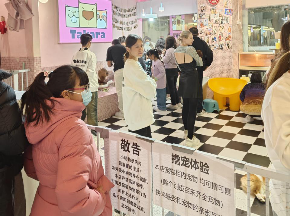 在商場(chǎng)四樓,一家貓咖前面擺了幾把椅子,其中一位大爺就是老板,負(fù)責(zé)收錢。30多平米的店里已經(jīng)擠滿了21個(gè)顧客,外加四十多只貓。還不斷有年輕女孩過來問,擼一次貓多少錢。一位做果切的老板告訴億邦動(dòng)力,年輕人不要做餐飲,不如去做美甲之類的面向年輕人的生意。