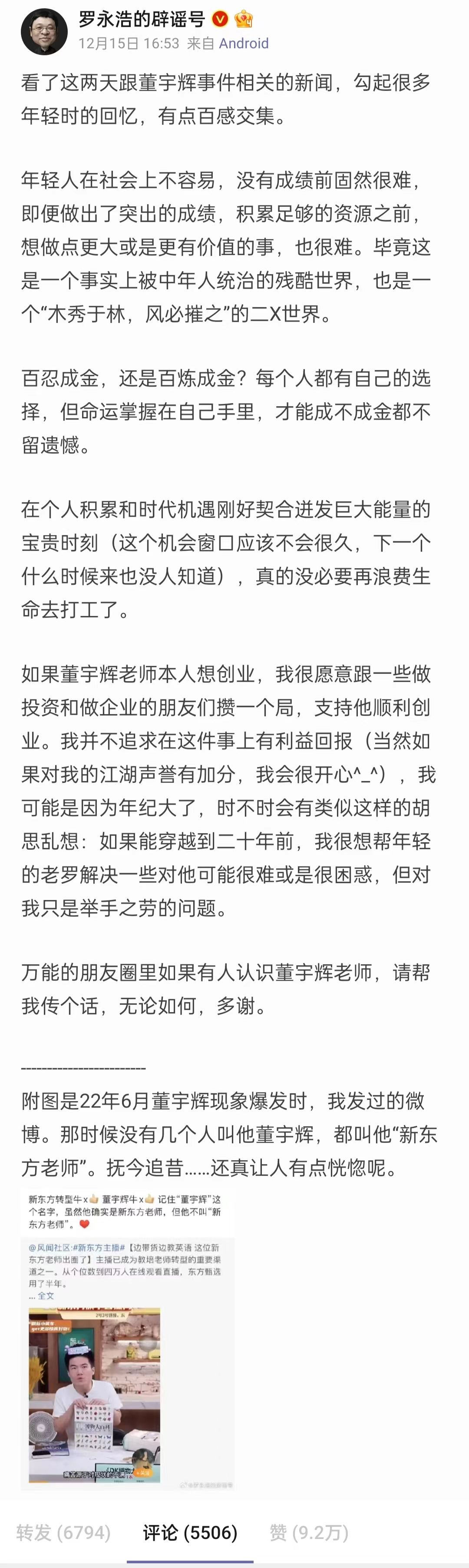 然而,在董宇輝事件期間,羅永浩卻一連發(fā)布了十幾條關(guān)心此事的微博,并在交個朋友直播間發(fā)表見解,引來了不少流量。他喊話董宇輝:“如果董宇輝老師本人想創(chuàng)業(yè),我很愿意跟一些做投資和做企業(yè)的朋友們攢一個局,支持他順利創(chuàng)業(yè)!