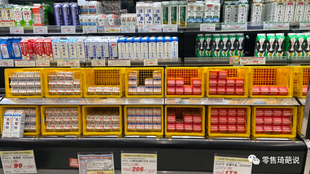 陳列方式非常簡單,食品的箱裝售賣多。牛奶也是直接按箱陳列。
