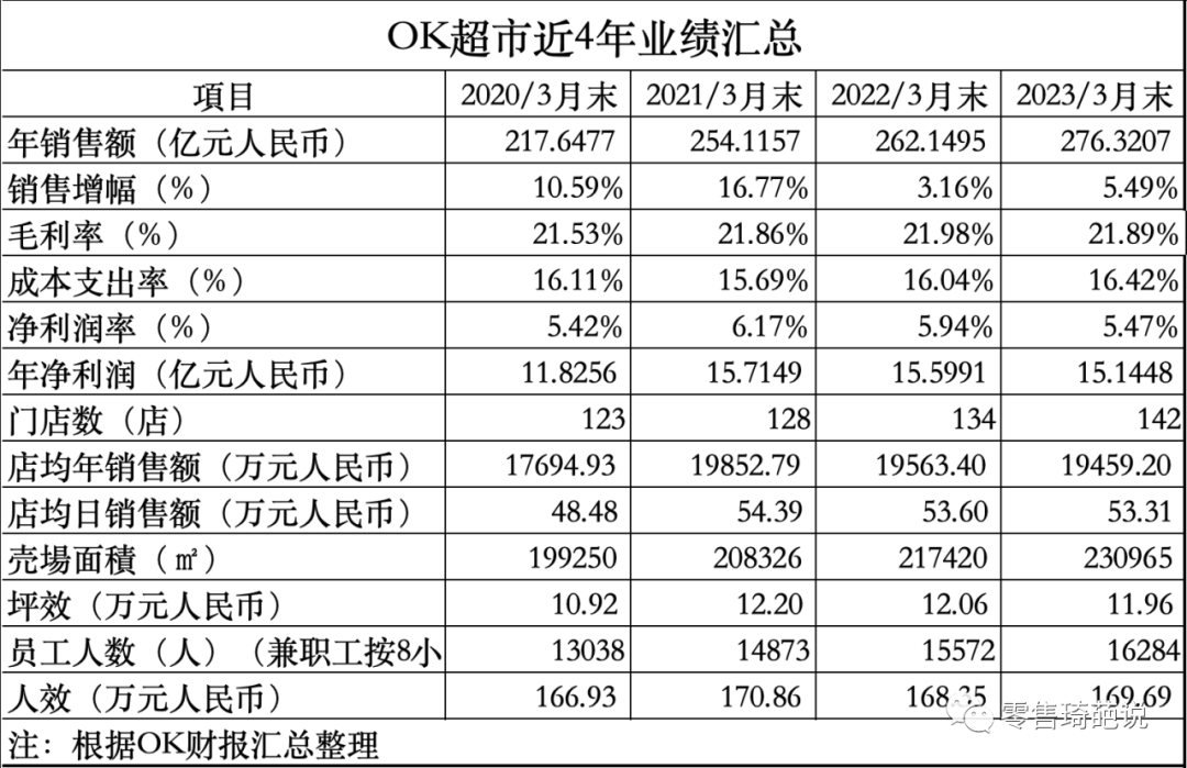 成立于1958年的OK超市,于1989年推出了全市最低價策略。截止2023年2月,年銷售額約276.2億元人民幣(5524億日元),凈利潤15.1億人民幣(約302.89億日元)凈利潤率高達5.47%,依靠自身多年來穩(wěn)健的拓展,已擁有142家門店,賣場面積23.0965萬㎡。單店1626.5㎡,創(chuàng)造出1.95億元/年,53.31萬元/天的銷售。