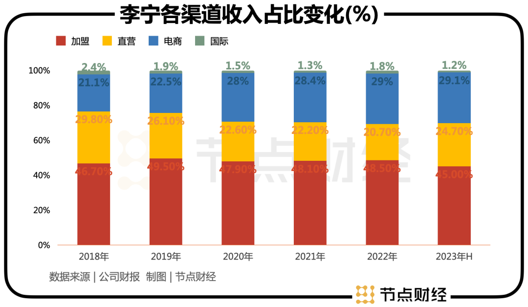李寧財報數(shù)據(jù)顯示,2018年-2022年,公司直營渠道的收入占比從29.8%降至20.7%,同期電商渠道的收入占比從21.10%上升至29%,直營渠道與電商渠道幾乎走了個對調,加盟渠道略有下降,但占比依然高達45%。