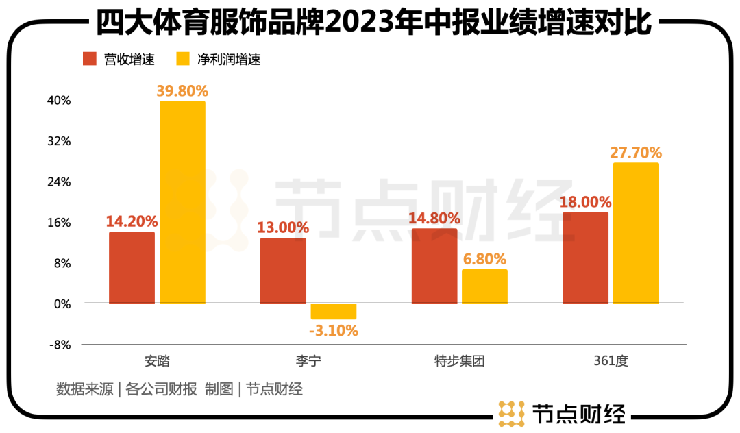 今年上半年,李寧交出了一份營收同比增長12.98%,歸母凈利潤同比增速-3.11%的中報成績單,這份中報不僅延續(xù)李寧2022年收入放緩的趨勢,也讓公司成了四大國產(chǎn)體育品牌中唯一一個凈利潤出現(xiàn)負增長的品牌。
