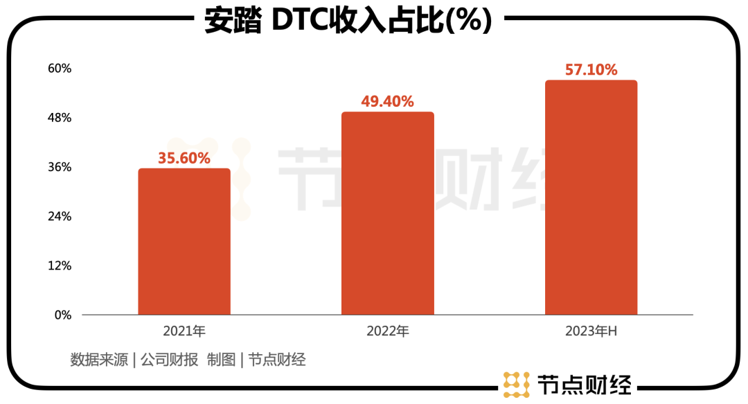 截至今年上半年,李寧總共有1423家直營店,僅占其門店總數(shù)的23%。相較2020年才開始DTC改革的安踏,目前直營店的數(shù)量占比已經(jīng)來到了近一半。安踏2023年中報顯示,公司截至2023年6月底的5500家門店中,有43%為品牌直營店,這些直營店為安踏貢獻了57.1%的收入。
