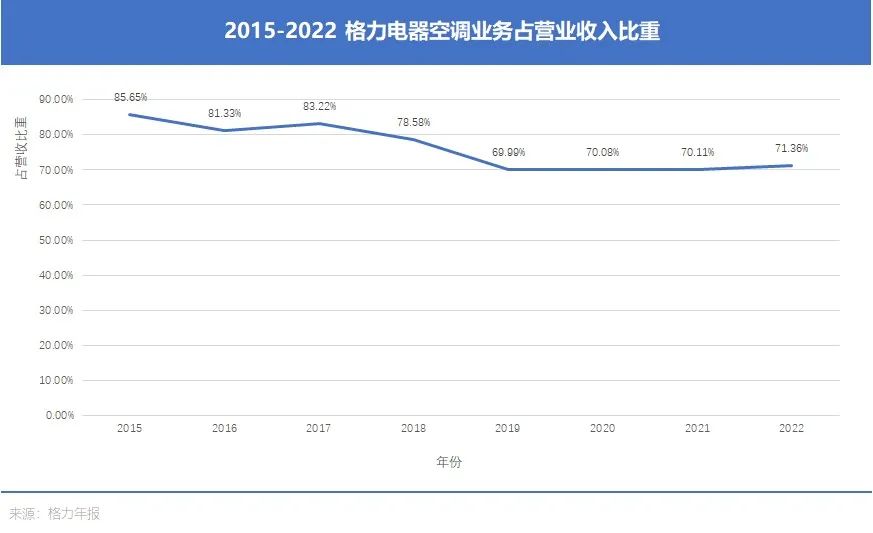 把時間線拉長來看,多元化業(yè)務嘗試,雖不至于說毫無效果,空調業(yè)務占比確實有所下降,但在總營收中依然占七成以上,對于格力這樣的龐然大物來說,難言稱得上成功。(見下圖)