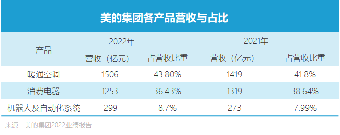 與此同時,美的、海爾、奧克斯等對手們都在積極轉型。除了渠道上的變革,美的在業(yè)務上也相對更加成功,已經形成了以暖通空調和消費電器為主的業(yè)務體系,且兩大業(yè)務在營收中占比差距較小,整體安全邊際較高。(見下圖)