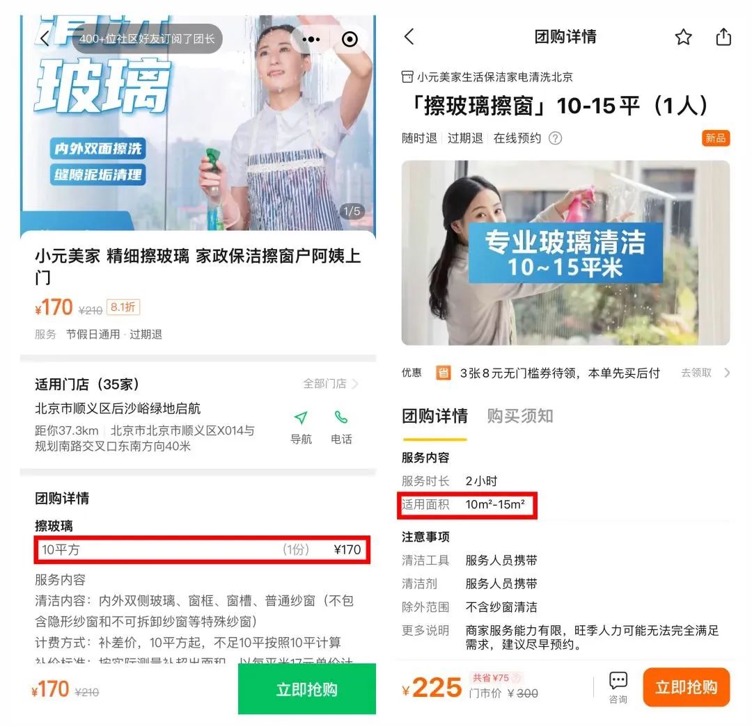以上海的“小元美家擦窗服務(wù)”為例,快團團上的標價是170元/10平方米,而美團上定價為225元,適用面積10-15平方米。