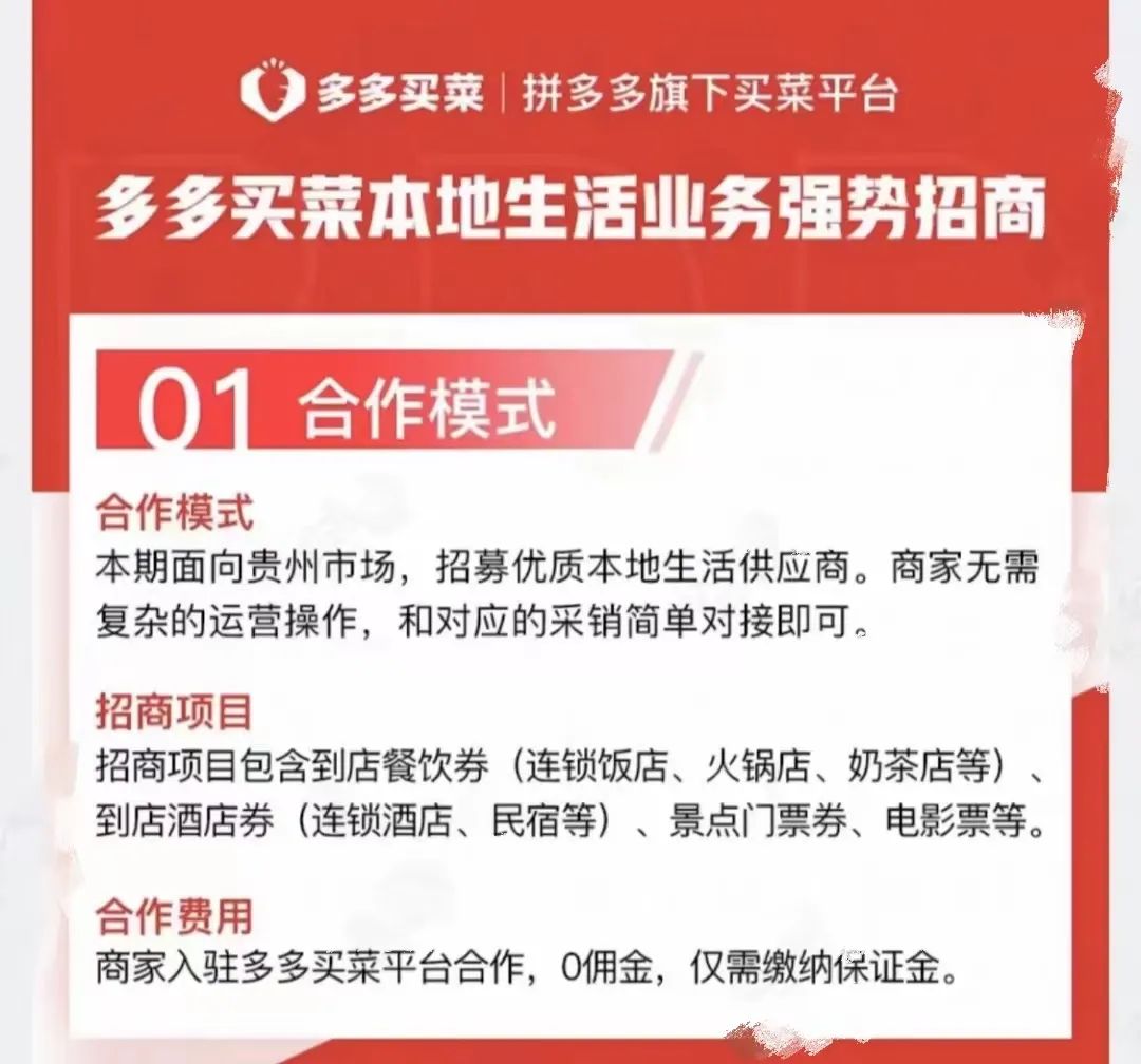 目前,多多買菜本地生活采取零傭金的合作模式,商家只需繳納保證金即可入駐。