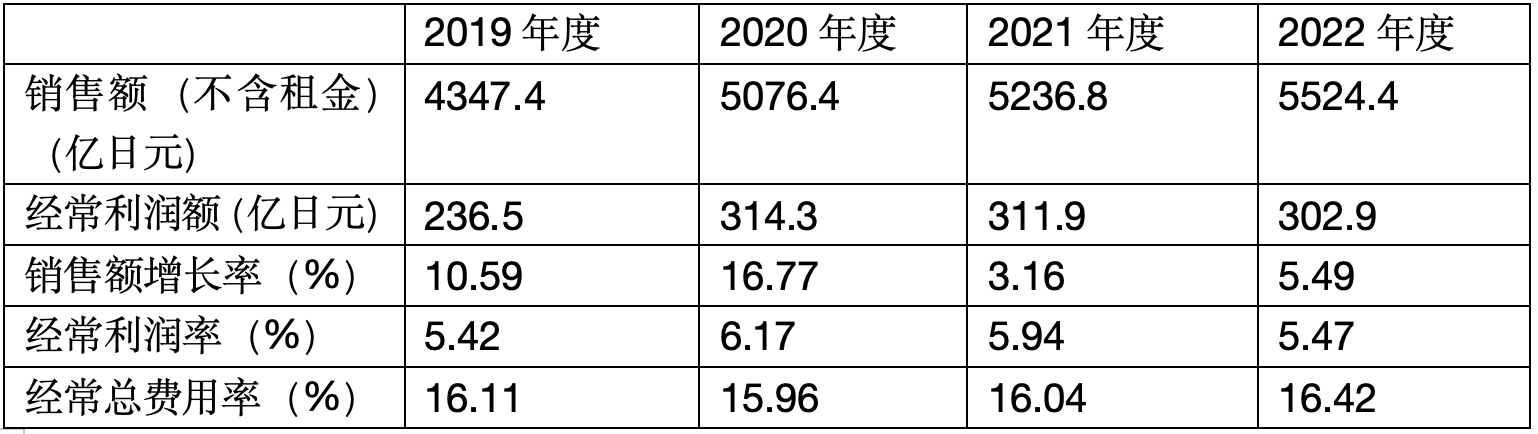 從2022年度的經(jīng)營(yíng)數(shù)據(jù)看,經(jīng)?傎M(fèi)用率16.42%,銷售成本率77.99%,顧客總?cè)藬?shù)增長(zhǎng)5.9%,高于上年的同比5.4%,不考慮新開店,現(xiàn)有店鋪顧客人數(shù)增長(zhǎng)2.6%,高于上年的同比1.8%。經(jīng)常利潤(rùn)下降2.9%,主要原因是電力等能源費(fèi)用漲價(jià)轉(zhuǎn)移生成。