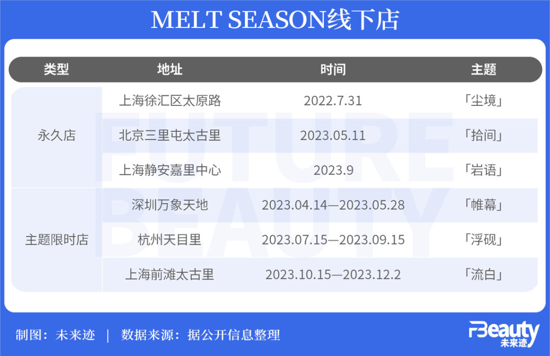 2022年,melt season在上海徐匯區(qū)太原路開出首個(gè)品牌旗艦店「塵境」;今年(2023年)5月和9月,又先后在北京三里屯太古里開出北京首店「拾間」,以及在上海嘉里中心店「巖語」。除了三家旗艦店,melt season在今年還陸續(xù)在深圳萬象天地、杭州天目里、上海前灘太古里開出主題限時(shí)店,以觸達(dá)更多消費(fèi)人群。