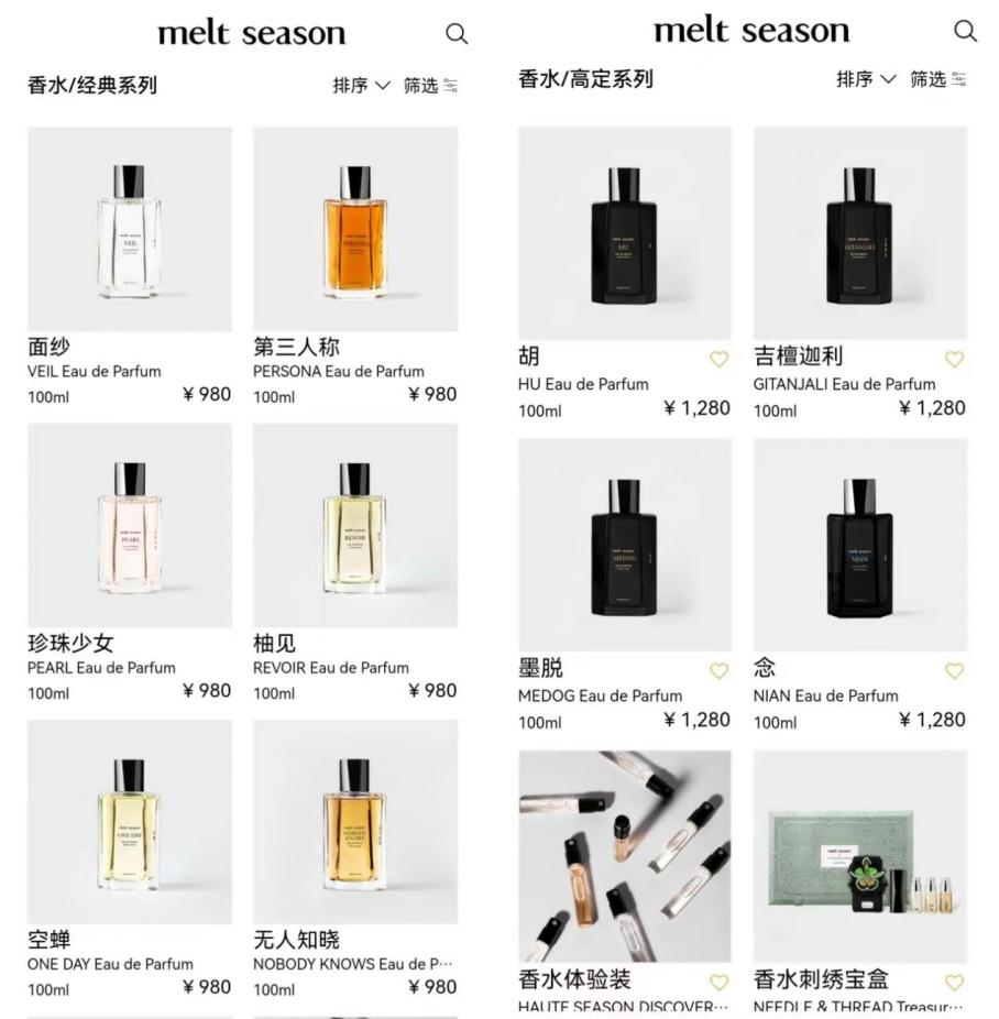 至今,melt season仍未入駐天貓、京東、抖音等電商平臺(tái),線上銷售渠道僅有品牌官方微信商城小程序。上線兩年的時(shí)間里,melt season共有兩次上新,截至目前品牌共有4款高定系列和6款經(jīng)典系列的10支香水產(chǎn)品。