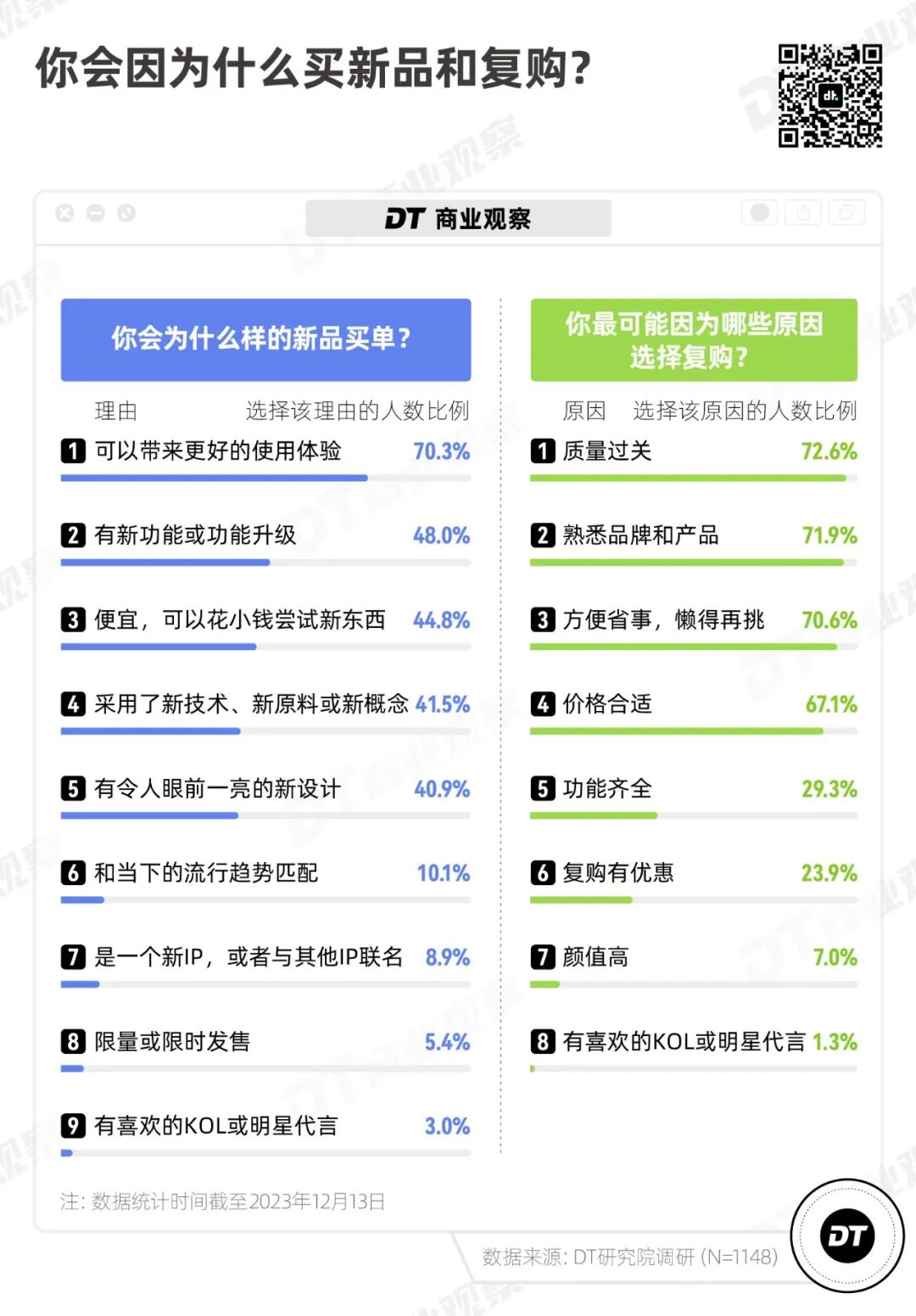 調(diào)研數(shù)據(jù)也顯示,KOL推薦、明星代言和“大品牌”“新概念”,已經(jīng)無法打動年輕人支付溢價了。而在“你會因為什么原因選擇復(fù)購”問題下,“質(zhì)量過關(guān)”被排在了第一位。