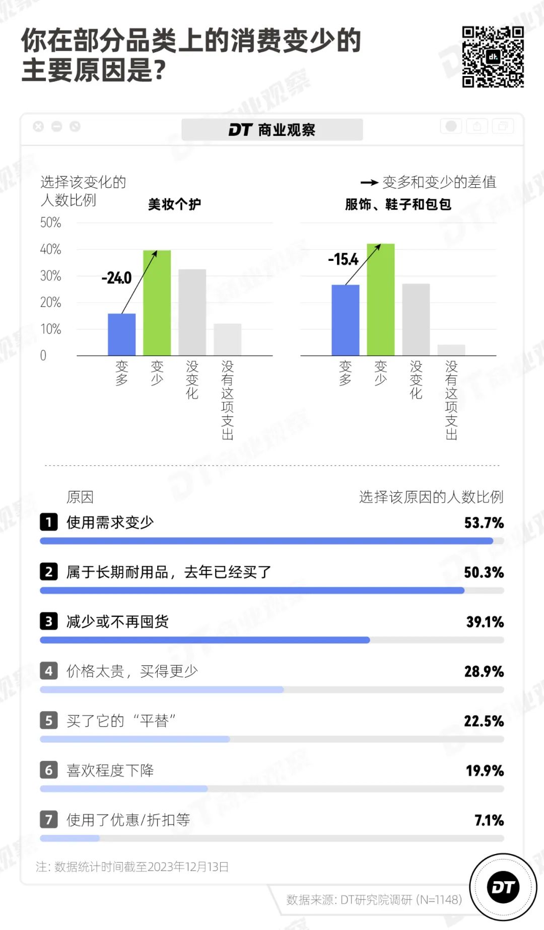使用需求變少、去年已經(jīng)買了、減少或不再囤貨分別位列“消費變少的原因”前三。