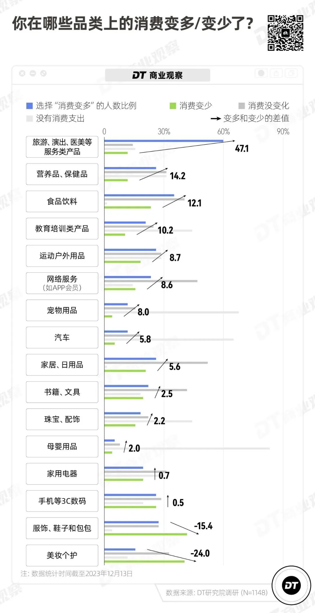 最明顯的是,在旅游、演出、醫(yī)美體驗等服務(wù)類產(chǎn)品上,開支變多。
