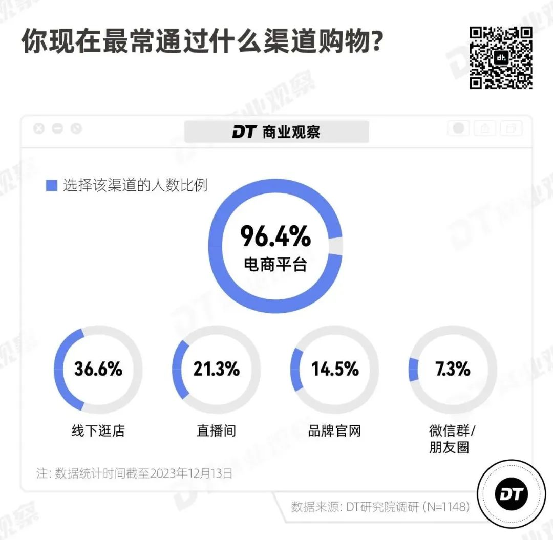 雖然目前人們最常用的購物方式還是電商平臺(96.4%),但有36.6%的人同時選擇了“線下逛店”,高于直播間購物(21.3%)。