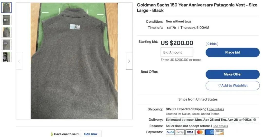 Patagonia給高盛做的150周年紀(jì)念背心,曾在國(guó)外拍賣網(wǎng)站Ebay上標(biāo)價(jià)200美元(約合人民幣1426元)出售,是發(fā)售價(jià)的三倍,詳情頁(yè)擲地有聲:Patagonia可不會(huì)再給高盛做衣服了。