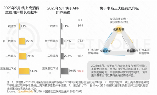 根據(jù)Q&M數(shù)據(jù),2023年9月快手用戶畫像中,一線、新一線和二線城市用戶占比接近40%;三至五線城市及以下用戶占比60%,這一用戶群體可支配收入高,消費(fèi)意愿強(qiáng)。