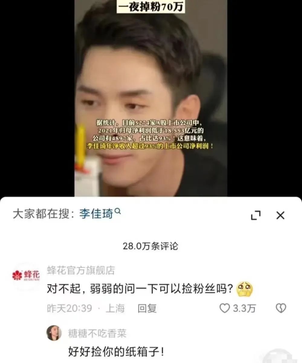 在花西子風(fēng)波前,蜂花還因“撿紙箱子”榮登熱搜。有網(wǎng)友發(fā)現(xiàn),蜂花連快遞箱都用的別家商品牌子,調(diào)侃蜂花“非常勤儉持家”、“低碳環(huán)保節(jié)能”。隨后,蜂花也在抖音直播間半開玩笑地回應(yīng):“紙箱都是我撿來的,沒有偷也沒有搶哦。”