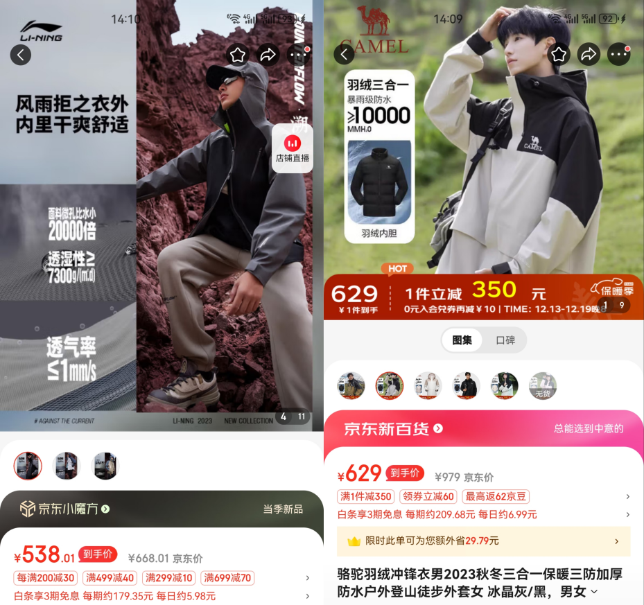 ▲圖:單件李寧沖鋒衣和三合一駱駝沖鋒衣