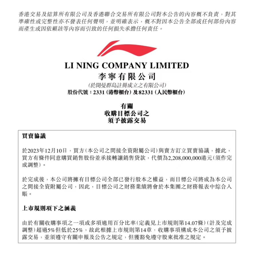 ▲圖:李寧公司公告