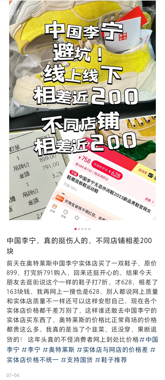 最讓消費者無法接受的是,由于庫存巨大、全渠道傾銷,李寧出現(xiàn)“一邊漲價,一邊打折”的情況。小紅書上一位用戶發(fā)帖稱:“中國李寧線上線下相差近200,不同店鋪相差近200”,覺得自己“當(dāng)了個韭菜,果斷退貨”。
