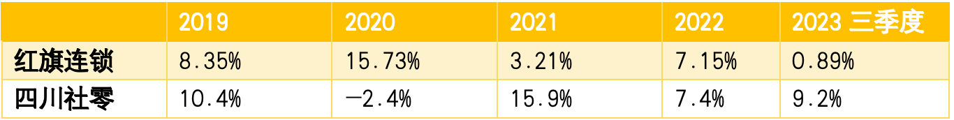 2019年紅旗連鎖和四川社零都保持較好增長態(tài)勢;到2020年紅旗連鎖開始享受特殊紅利,而四川社零出現(xiàn)不可控因素而承壓;2021年四川社零開始報復(fù)性反彈,紅旗連鎖的紅利明顯減少;2022年逐步恢復(fù)到相對同步增長;2023年三季度四川社零繼續(xù)高速增長,實現(xiàn)9.2%增長率,紅旗連鎖數(shù)據(jù)開始偏離經(jīng)濟同步增長,出現(xiàn)較大偏離走勢,僅錄得0.89%的微增。