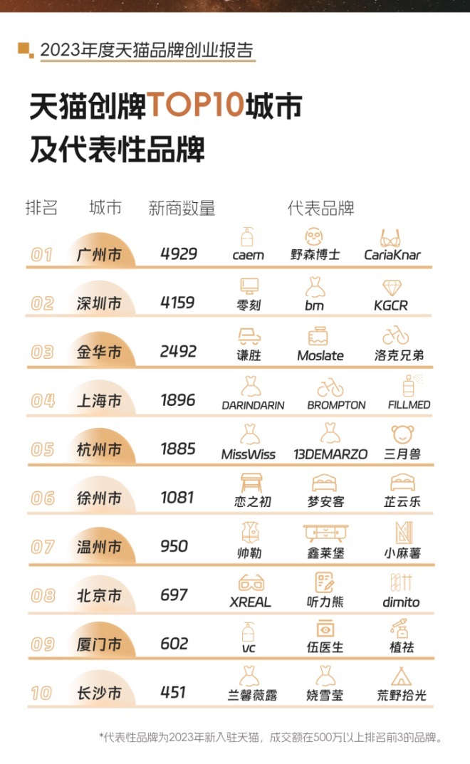 其中,健康養(yǎng)生成2023年品牌創(chuàng)業(yè)最火賽道,天貓新開店數(shù)超1萬(wàn)家;滄州漁具成為品牌創(chuàng)業(yè)增長(zhǎng)最快特色產(chǎn)業(yè)帶,新開店數(shù)同比增長(zhǎng)超2700%;廣州拿下年度品牌創(chuàng)業(yè)第一城,2023年天貓新開店鋪中,注冊(cè)地為廣州的有近5000家。