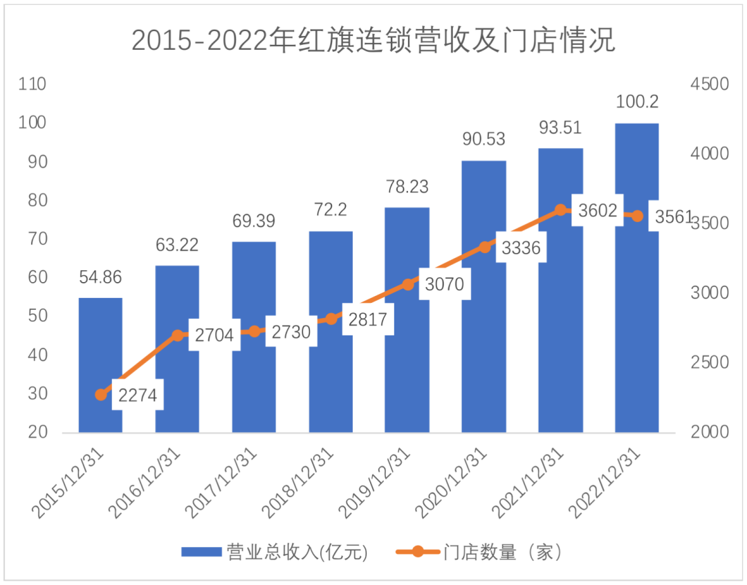 2012年,紅旗連鎖在深交所上市,當(dāng)時(shí)的上市招股書中披露,2012年其門店數(shù)量為1211家;2023年紅旗連鎖公告披露,截至2023年6月底,共有3592家門店,相比于2022年末的3561家凈增加31家。在11年時(shí)間里,紅旗連鎖新增2300多家門店。