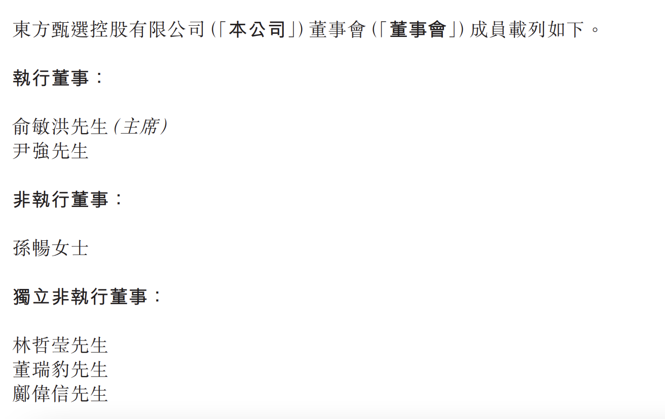 自此, 東方甄選董事會(huì)成員如下: