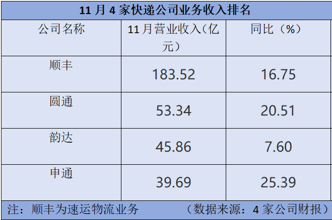 圓通速遞的11月營業(yè)收入為53.34億元;韻達股份緊隨其后,營業(yè)收入為45.86億元;申通快遞的11月份營收較低,為39.69億元。
