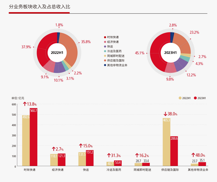 今年上半年,順豐取得營收1243.66億元,分業(yè)務(wù)看,時效快遞業(yè)務(wù)、經(jīng)濟快遞業(yè)務(wù)、快運業(yè)務(wù)、冷運及醫(yī)藥、同城即時配送收入分別增長13.8%、2.7%、15%、31.3%、16.2%。