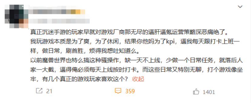 “我玩游戲本質是為了爽,為了休閑,結果你他媽為了kpi,逼我每天跟打卡上班一樣,做日常,刷首勝,煩得我想吐知道么。”