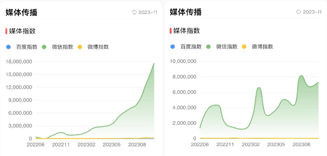 在媒體指數(shù)上,這些品牌的熱度亦持續(xù)高漲。紅餐大數(shù)據(jù)顯示,截至2023年11月,茶顏悅色和霸王茶姬的媒體指數(shù)均呈上升趨勢。此外,茶飲品牌的這股“國潮風(fēng)”也吹進了咖飲賽道,紅餐大數(shù)據(jù)顯示,茶顏悅色旗下的咖啡品牌“鴛央咖啡”,喜茶旗下的“喜鵲咖”都加入了新中式基因,并因此大獲好評。