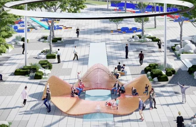 藝術(shù)大道為鏈接南北區(qū)的中央大街,設(shè)計(jì)以水為引,將水的不同狀態(tài)融入設(shè)計(jì):入口的互動(dòng)噴泉、中軸的鏡面水景、盡端的圓環(huán)水霧,麓客們可在此與水產(chǎn)生多元感官互動(dòng),在繁忙重壓下舒緩壓力。