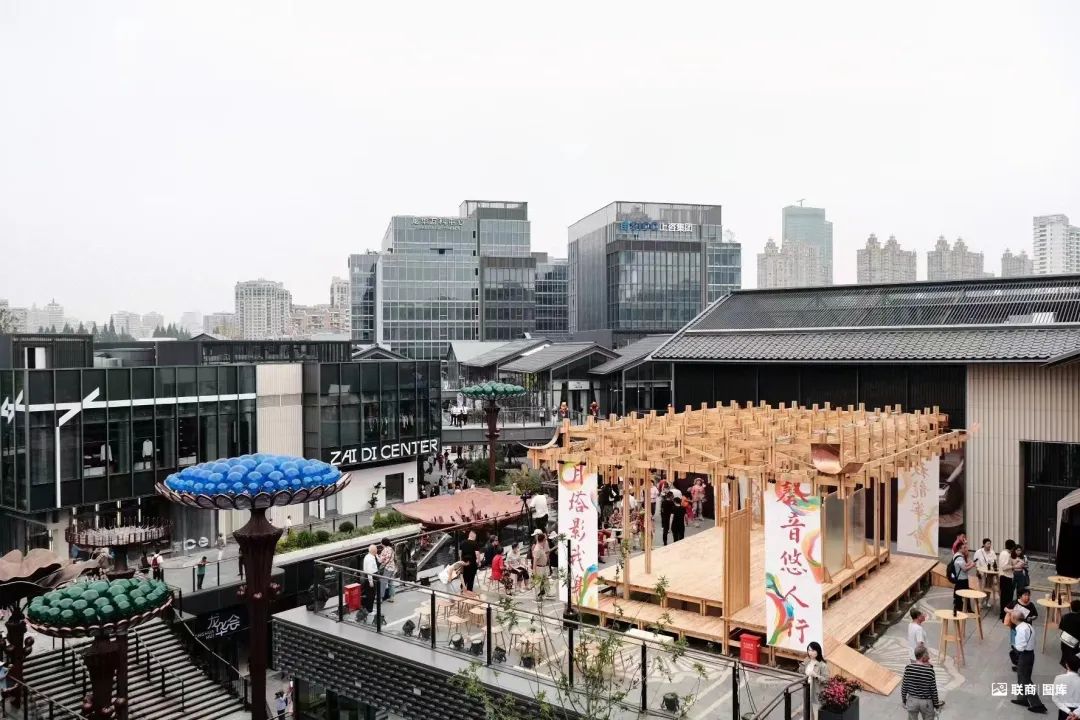 傳統(tǒng)中式建筑中的廟市、創(chuàng)山、若水、林道、街巷、竹林、桃園、節(jié)氣花園、浮橋空間等元素的高度滲透;正對(duì)龍華塔的步行主入口的草坪上,定制了一個(gè)名為“塔影”的打卡裝置,用視覺可見的藝術(shù)形式,將“塔影”固化;二樓露臺(tái)的“龍華戲臺(tái)”是重頭戲,最大程度的還原了傳統(tǒng)梨園文化,為商業(yè)與傳統(tǒng)文化的融合共創(chuàng)提供新的方向。