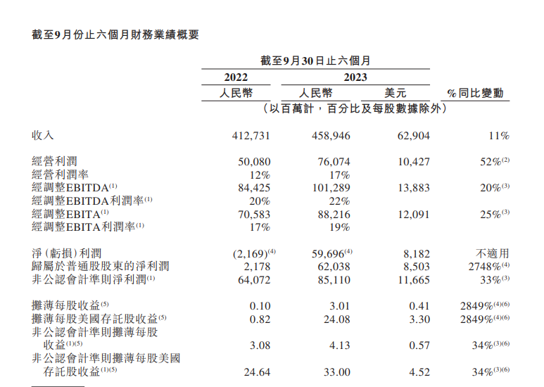2024財(cái)年中期報(bào)告顯示,截至2023年9月30日,阿里在短短六個(gè)月內(nèi)的收入高達(dá)4589.46億元,實(shí)現(xiàn)了11%的同比增長。同時(shí),其經(jīng)營利潤也達(dá)到了760.74億元,同比增長52%。這一喜人的成績主要得益于公司收入的穩(wěn)步增長和運(yùn)營效率的持續(xù)提升。