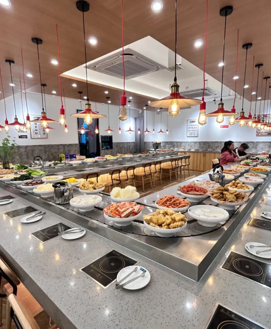 在模式上,同前幾年盛行的旋轉(zhuǎn)壽司、旋轉(zhuǎn)小火鍋類似,門店會(huì)設(shè)置旋轉(zhuǎn)自助餐臺(tái),會(huì)將菜品放好,一直循環(huán)旋轉(zhuǎn)上菜,顧客根據(jù)自己需要和口味拿取直接涮到面前的小火鍋中。