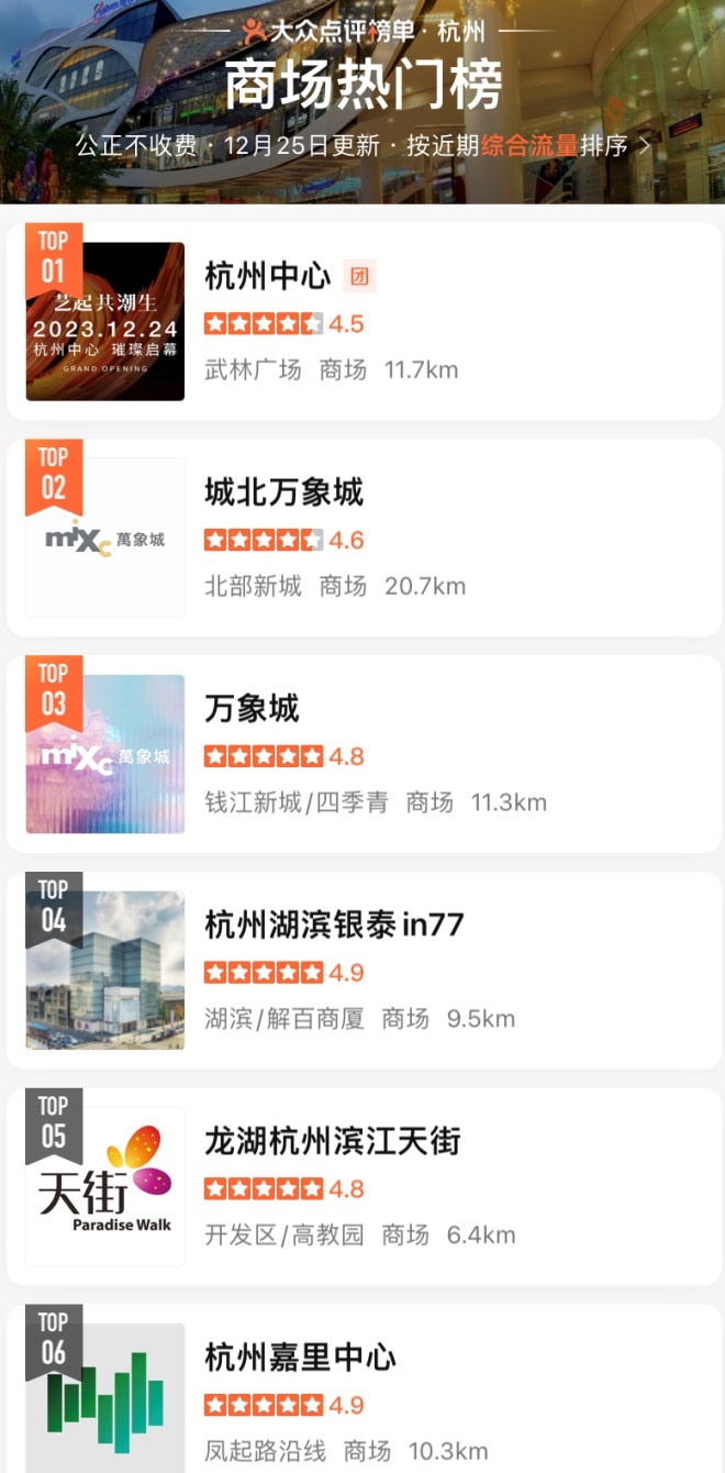 在第三方平臺數(shù)據(jù)上,大眾點評最新更新的杭州商場熱門榜中,杭州中心穩(wěn)居首位;高德地圖中杭州中心近期的導(dǎo)航搜索飆升指數(shù)高達1644%,幾乎是其他商場的近200倍;12月25日高德指南購物榜杭州中心位列22位,12月26日已經(jīng)躥升至全城第五位。
