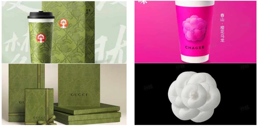 霸王茶姬沒有停下與大牌“撞臉”的腳步,今年又繼續(xù)推出了好幾款新包裝,不仔細看的話,很難分辨出它們與CHANEL的山茶花元素、Gucci的配色風格、LV的花紋之間有什么區(qū)別。