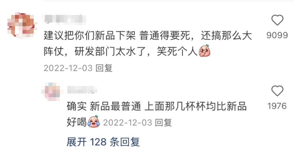 伯牙絕弦已經累計賣出了一億杯,是霸王茶姬當之無愧的明星單品。盡管霸王茶姬仍然在不斷地推出新品,甚至為了控制單品量,時不時下架已有單品,給新品讓位,但至今市場仍未看到下一款爆品的可能性。甚至在每一次上新的評論區(qū)里都能看到大量粉絲在吐槽新品難喝。