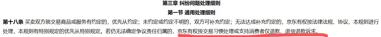 而淘寶的僅退款,主要基于對賣家的店鋪品質(zhì)指標(biāo)、客訴等負(fù)面信息來判定,如若符合相關(guān)情景,將直接做出僅退款的的支持;京東則表述為”京東有權(quán)按交易習(xí)慣處理或支持消費(fèi)者僅退款、退貨退款訴求!