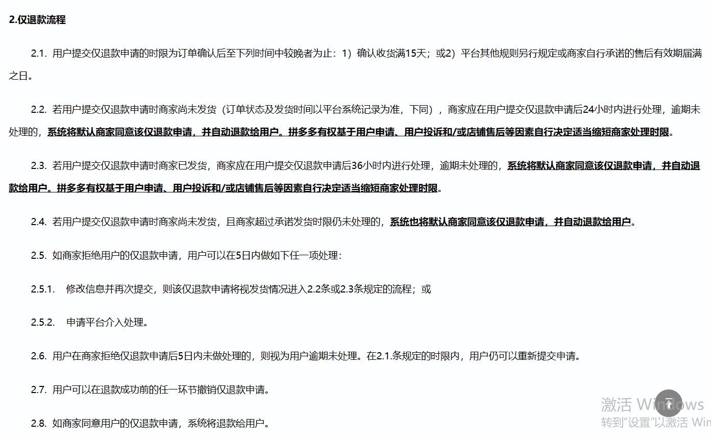 而拼多多的僅退款流程頁面,并沒有對商家以及用戶做過多描述。僅多次提到“拼多多有權(quán)基于用戶申請、用戶投訴/或店鋪售后等因素自行決定縮短商家處理時(shí)限!