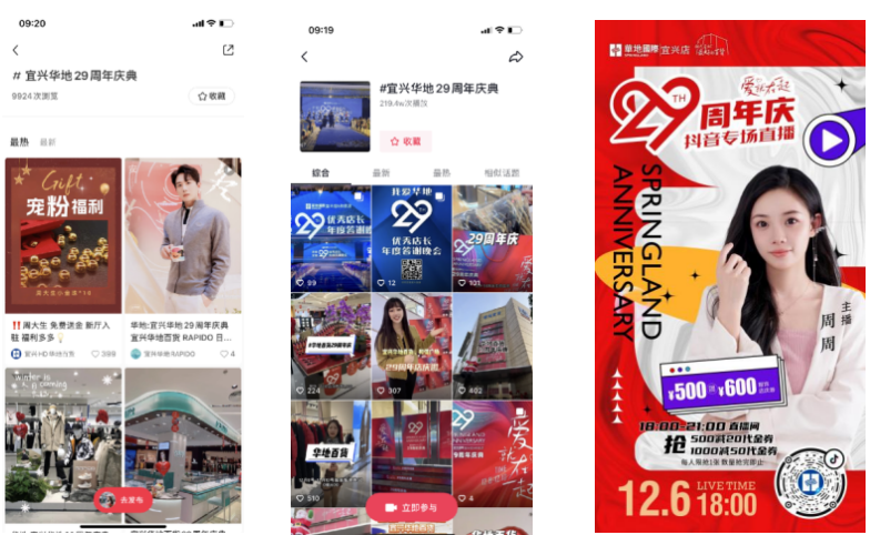 結(jié)合宜興華地29周年慶典創(chuàng)新話題,通過內(nèi)部一千多號員工聲浪發(fā)聲賽,霸屏小紅書、視頻號、抖音等各大新媒體平臺!其中抖音獲得了近200W+的曝光量!