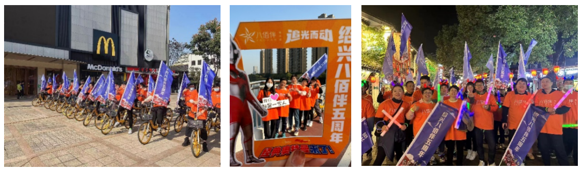 預(yù)熱期紹興八佰伴利用抖音、小紅書(shū)、公眾號(hào)等平臺(tái)持續(xù)曝光PR活動(dòng)內(nèi)容,打造#紹興八佰伴5周年 線上話題,助燃店慶檔期。并于28日舉行騎行&夜跑活動(dòng),員工統(tǒng)一身著5周年文化衫和宣傳旗幟到5公里范圍內(nèi)的人流密集場(chǎng)所進(jìn)行打卡宣傳! 活動(dòng)過(guò)程中吸引了不少路人來(lái)詢問(wèn)具體是什么活動(dòng),員工向其宣傳餐飲、零售服飾等折扣活動(dòng)并引導(dǎo)顧客到店與紹興八佰伴共同慶生。