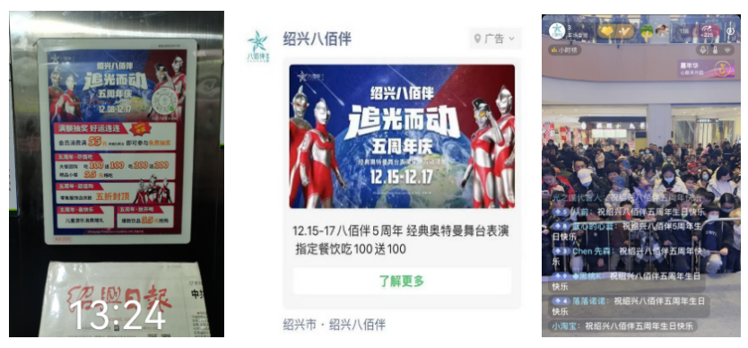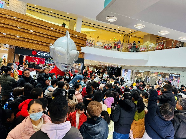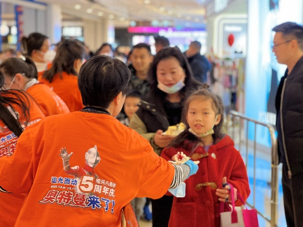 這也是經(jīng)典奧特曼的美陳首次落地紹興,改造了商場(chǎng)的整體氛圍。特別推出經(jīng)典奧特曼降臨、經(jīng)典奧特曼巡游+舞臺(tái)表演等系列PR活動(dòng)給顧客帶來(lái)視覺(jué)沖擊,推出在12月16日5周年巨型慶生蛋糕免費(fèi)吃活動(dòng),同時(shí)匹配了各種的優(yōu)惠促銷活動(dòng),如大餐吃100送100,小吃飲品5.5元秒殺、店慶童玩半價(jià)、零售服飾店慶款封頂5折等活動(dòng)進(jìn)行加碼,實(shí)現(xiàn)了客流的高增長(zhǎng)和流量變現(xiàn)。