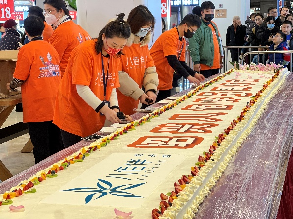 16日晚上6點(diǎn),商場(chǎng)一樓排起了長(zhǎng)隊(duì),等待分享這款由蛋糕師傅現(xiàn)場(chǎng)制作、長(zhǎng)約11米的巨型蛋糕,共同慶祝紹興八佰伴5周年。工作人員把蛋糕一塊塊分發(fā)給現(xiàn)場(chǎng)的顧客們,大家一邊品嘗著美味的蛋糕,一邊共享這份喜悅。顧客甚至主動(dòng)發(fā)朋友圈宣傳活動(dòng),門庭若市的氛圍也涌現(xiàn)了更多的人前來(lái)參與。
