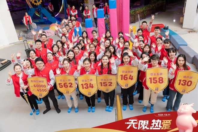 在游戲互動中增進(jìn)團(tuán)隊凝聚力、在集體宣誓中提升信心。于高臺上一起宣誓——火力全開,鏖戰(zhàn)店慶。