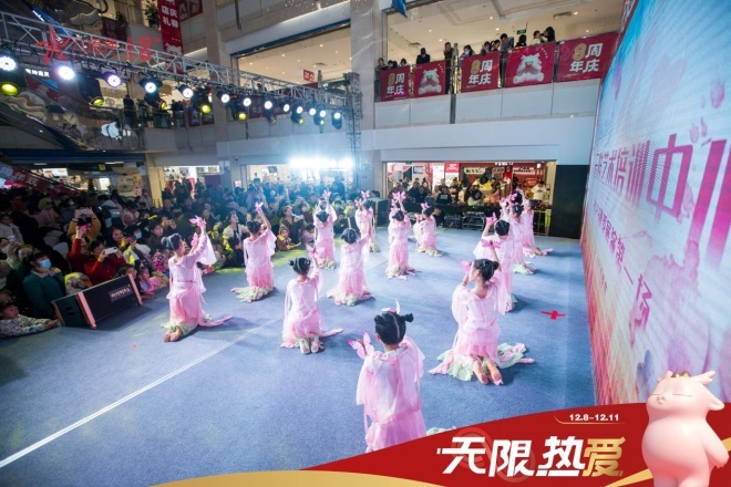 8周年慶期間,聯(lián)合小太陽舞蹈與云娃舞蹈開展國風(fēng)舞蹈文藝匯演,和異業(yè)合作通過線上報名,兩百個多個小朋友參與兩天的舞蹈匯演,連續(xù)兩天單日客流突破1.5w,商場中庭座無虛席,人流如潮。同時帶動小餐美食城單日銷售。