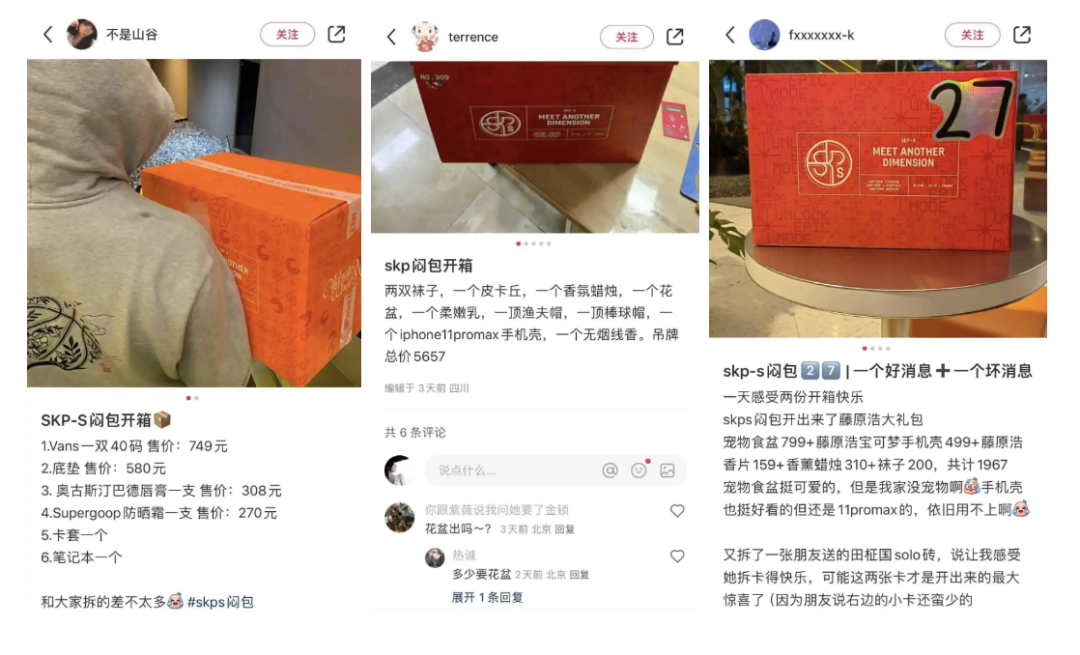 所謂搶到就是賺到。在SKP花299元賭運(yùn)氣,成了考驗(yàn)手速兼運(yùn)氣的最佳方式。有人開出價(jià)格上千元的滑雪板,有人拿到了藤原浩聯(lián)名大禮包,也有說“抽到鞋就是血賺”。只是人類的悲喜并不相通,另一頭不養(yǎng)寵物的人抽到了寵物食盆、不養(yǎng)花的打工人抽到了原價(jià)1299的花盆、早就換了手機(jī)的抽到莫名其妙的iphone11pro手機(jī)殼、或是已經(jīng)沒什么味道了的香片。