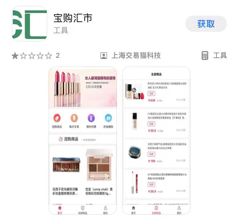 寶購匯市App延續(xù)淘寶模式的品類邏輯,設(shè)有團購商品、每日專享、限時特惠和熱銷爆款等4個頻道。商品界面展示全平臺售賣商品,以女性化妝品為主,比如粉底液、口紅和精華等,涵蓋Dior、花西子、Passional Lover等國內(nèi)外多個品牌。